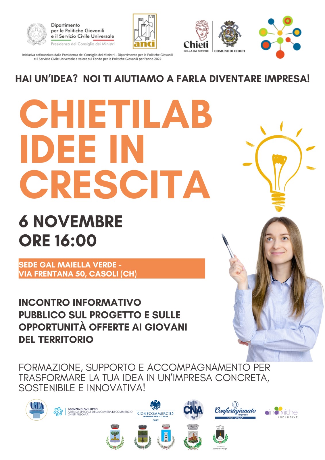 Il Comune di Lama dei Peligni, in qualità di partner del progetto “ChietiLab_Idee in Crescita – Insieme per l’Imprenditorialità”, comunica l’attivazione di sportelli gratuiti di orientamento e consulenza rivolti ai giovani tra i 18 e i 35 anni, residenti nella provincia di Chieti e interessati a sviluppare un’idea imprenditoriale concreta, sostenibile e innovativa.